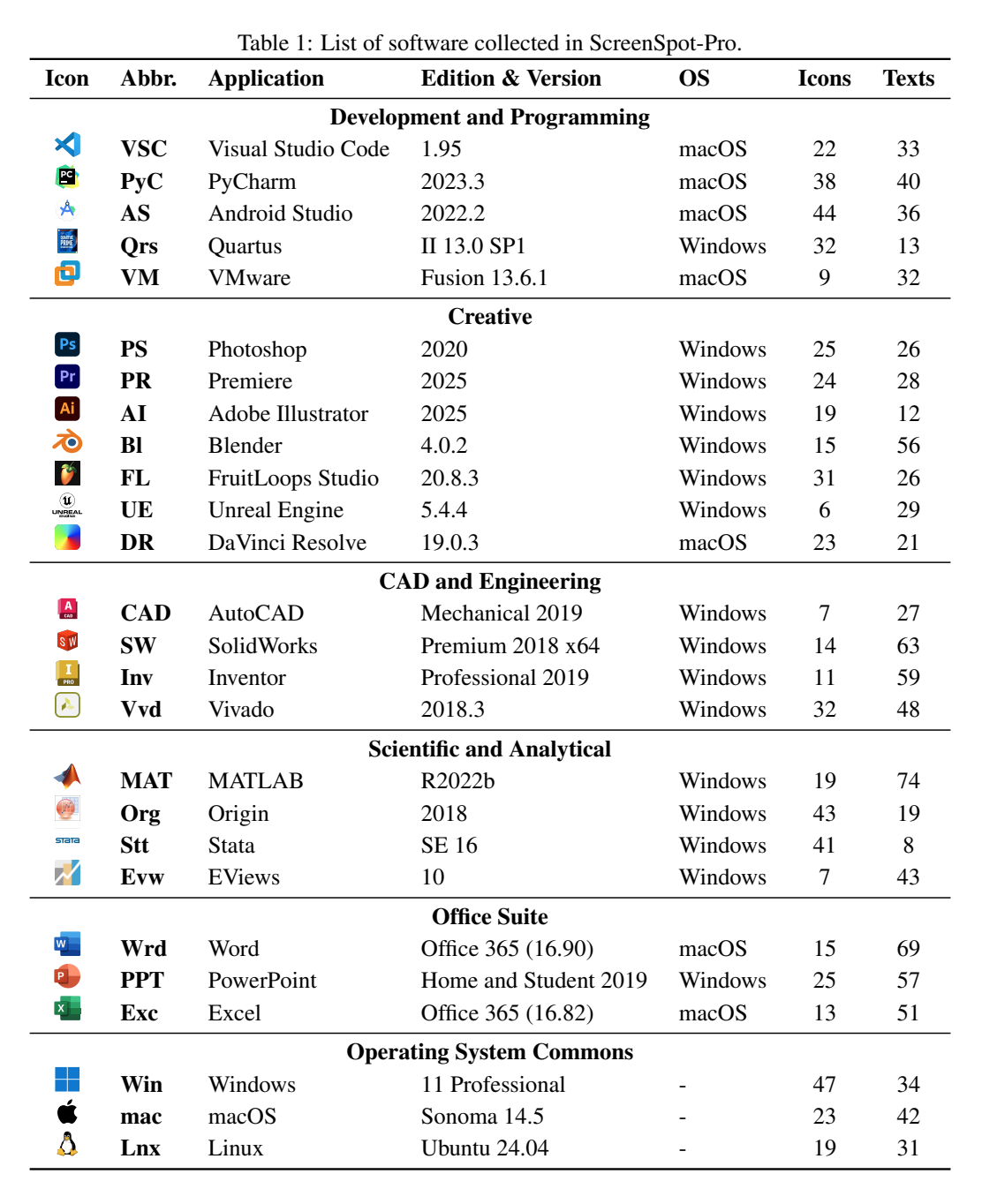 The benchmark was created by researchers at the National University of Singapore and published at ACM Multimedia 2025, one of the top academic conferences in the field. It covers 1,581 tasks across 29 professional applications spanning Windows, macOS, and Linux. The leaderboard is actively contested by teams from Alibaba (#4), H Company (#3, ex-DeepMind), Lenovo + Tsinghua University (#5), and Zhejiang University + Ant Group (#8), among others.